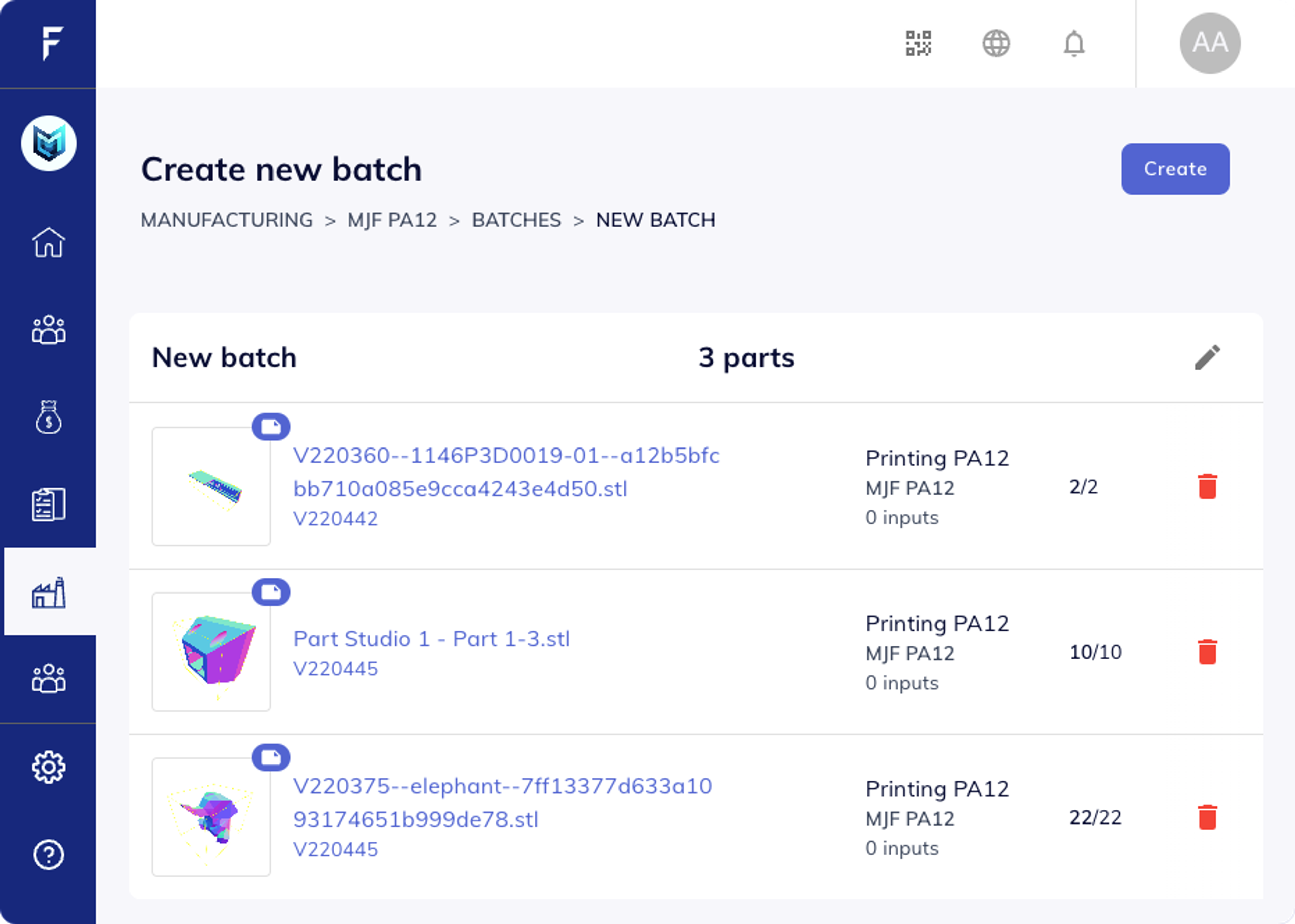 The original view, with 2 separate columns for parts have been added to the batch and the ones that haven't, that can be easily added with a click. The scrolling has been improved and limited to each list, allowing both of them to be always visible and making easier to create and update batches.