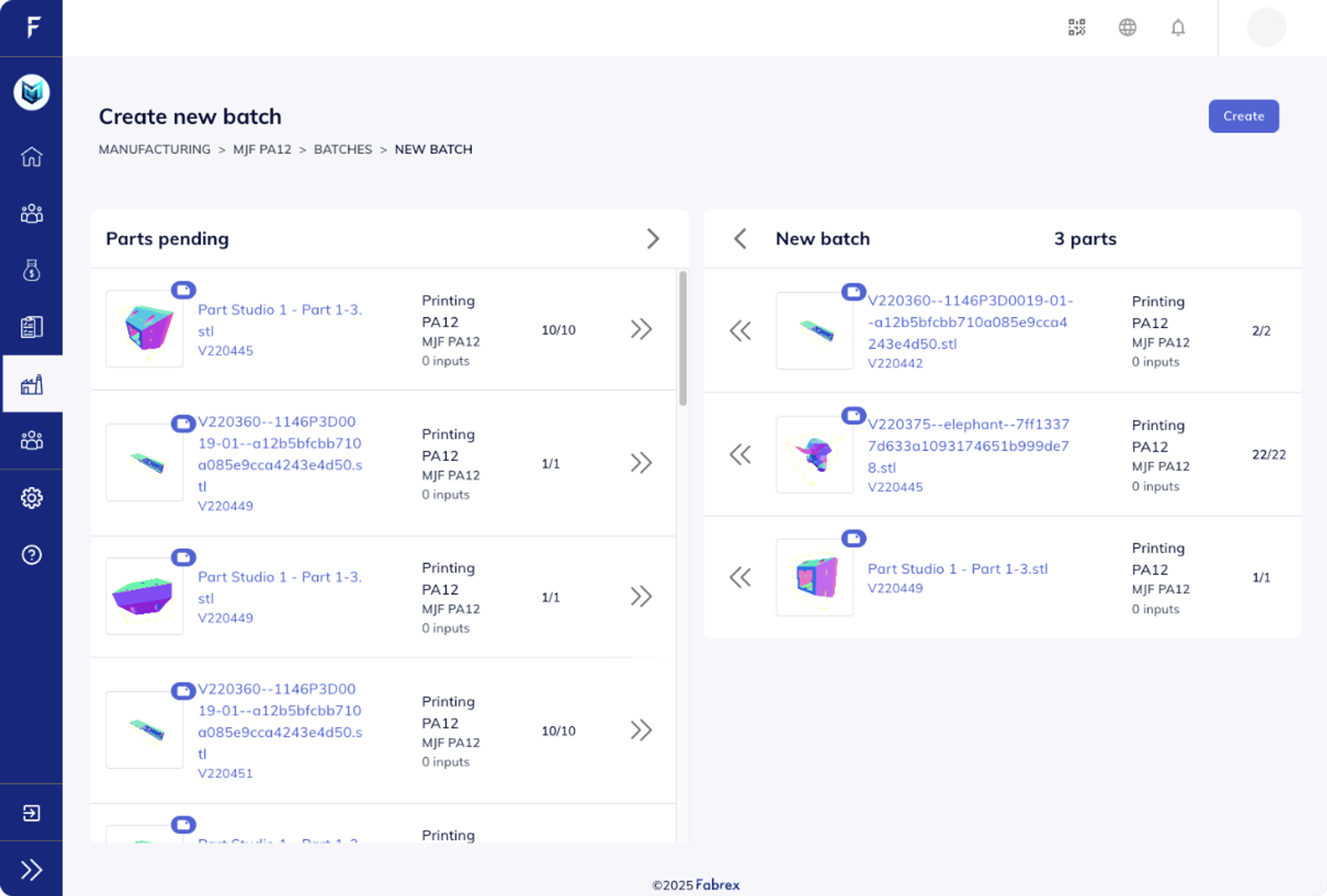 The original view, with 2 separate columns for parts have been added to the batch and the ones that haven't, that can be easily added with a click. The scrolling has been improved and limited to each list, allowing both of them to be always visible and making easier to create and update batches.
